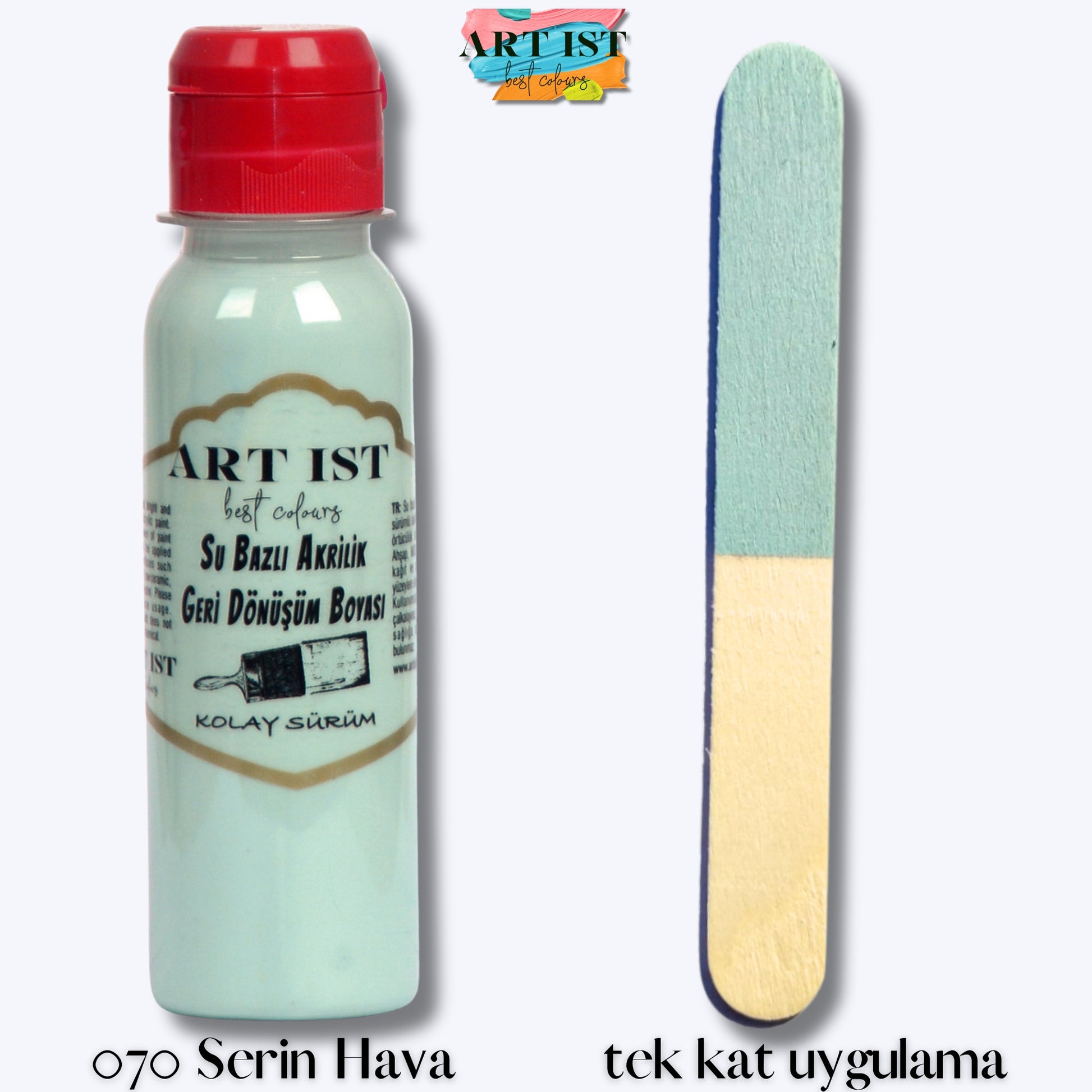 ART IST Geri Dönüşüm Boyaları, özellikle DIY geri dönüşüm projeleri için geliştirilmiş özel formülüyle öne çıkar. Su bazlı ve düşük kokulu yapısı sayesinde evde, atölyede veya sınıf ortamında rahatça kullanılabilir. Multisurfaces boyalara kıyasla biraz daha akışkan kıvamdadır, bu da sürümünü kolaylaştırır ve fırça izi bırakmadan pürüzsüz bir görünüm sağlar. Kapatıcılığı ise Multisurfaces serisiyle aynı seviyededir.